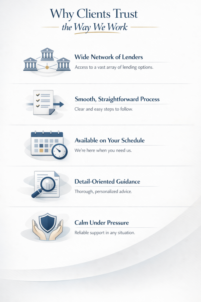 My job is to stay steady, solve problems early, and keep your application moving smoothly toward approval and settlement.